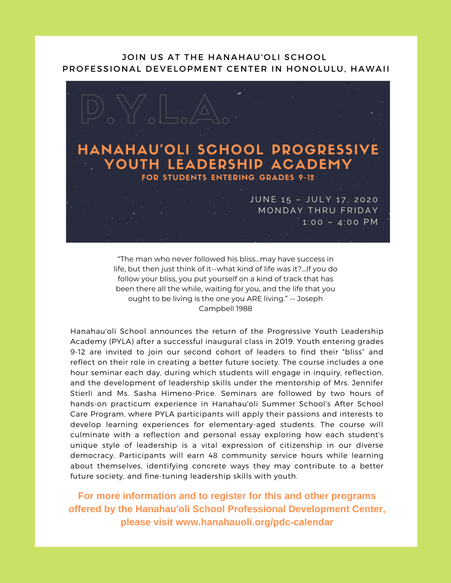 Hanahau’oli School announces the return of the Progressive Youth Leadership Academy (PYLA) after a successful inaugural class in 2019. Youth entering grades 9-12 are invited to join our second cohort of leaders to find their “bliss” and reflect on their role in creating a better future society. The course includes a one hour seminar each day, during which students will engage in inquiry, reflection, and the development of leadership skills under the mentorship of Mrs. Jennifer Stierli and Ms. Sasha Himeno-Price. Seminars are followed by two hours of hands-on practicum experience in Hanahau’oli Summer School’s After School Care Program, where PYLA participants will apply their passions and interests to develop learning experiences for elementary-aged students. The course will culminate with a reflection and personal essay exploring how each student’s unique style of leadership is a vital expression of citizenship in our diverse democracy. Participants will earn 48 community service hours while learning about themselves, identifying concrete ways they may contribute to a better future society, and fine-tuning leadership skills with youth.