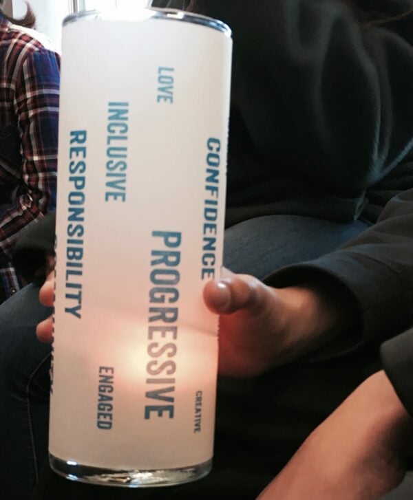 The candle is a leftover favor from a school event, and the words illuminated come from students who were asked to say what they think of when they think of our school, Francis W. Parker. We lit the candle to use as our talking piece, and students spoke about their feelings, reactions, hopes and fears; some even chose a word from the votive and focused on how they would embody the word in moving forward. Holding the light together, we felt the comfort of each other, the community that we share.